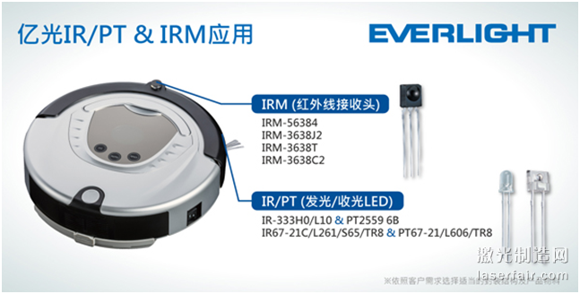 您是否知道掃地機器人有使用不少LED光電組件呢? 掃地機器人使用IR/PT及IRM,借以達到防碰撞、墜落、搖控、定位等功能。IR/PT以訊號發射接收,亦指當掃地機運作遇到障礙物時,可透過機身感應而變換方向,避開桌椅角、台階等,減少碰撞、防止掉落機會(hui) ,億(yi) 光IR-333H0/L10配對PT2559 6B發光角度40度,IR67-21C/L261/S65/TR8 配對PT67-21/L606/TR8為(wei) 超廣角120度,發光角度主要會(hui) 影響接受端的設計,一般需求約30度上下,但億(yi) 光亦提供廣角120度IR/PT供選擇,讓客戶在產(chan) 品設計上有更多調整的空間。IRM 紅外線接收頭主要有兩(liang) 大用途,首先是可精準地確認充電座的方向,協助當機身電力不足時,自動返回充電基座進行充電。另外,它還可使用於(yu) 搖控器上,搭配強大的運算,可覆蓋廣大的範圍,控製機身方向、模式、時間等。根據不同的通訊協議及抗幹擾能力的需求,提供全係列產(chan) 品供客戶選用 : IRM-56384、IRM-3638J2、IRM3638T、IRM-3638C2。