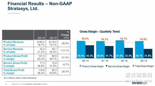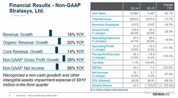 將這些數字對比來看,去年同期Stratasys的收入為(wei) 2.03億(yi) 美元,當時的GAAP淨虧(kui) 損為(wei) 3130萬(wan) 。而在本期,該公司的non-GAAP利潤為(wei) 70萬(wan) 美元,而2014年第三季度的則是3010萬(wan) 美元。本次報告還指出,該公司第三季度已經售出了5467套/台3D打印技術和增材製造係統。