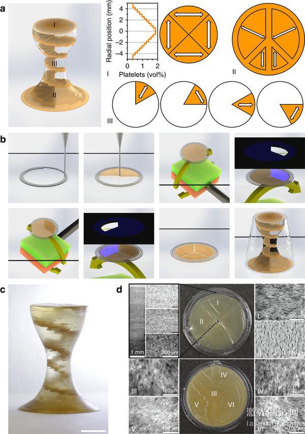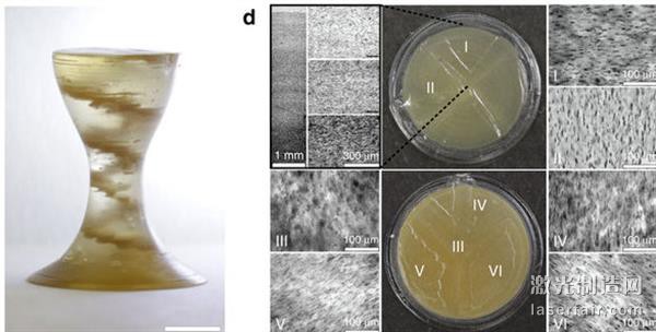 為(wei) 了展示自己開發的MM-3D打印平台所具備的定向、複合和形狀控製能力,研究人員打印出了一個(ge) 具有複雜形狀以及與(yu) 自然界完全不同的非均質精細微結構的3D對象(見上圖)。他們(men) 將這個(ge) 對象成為(wei) “螺旋”,該對象的外部呈現了各種不同的凸起和凹陷的曲麵,而其內(nei) 部則將眾(zhong) 多小片匯集成螺旋樓梯的形式,從(cong) 底部一直延伸到頂部。整個(ge) 對象的大小僅(jin) 為(wei) 18毫米,其圓形底座直徑為(wei) 16毫米,頂部直徑為(wei) 10毫米,總共由60個(ge) 圓形層組成。科學家們(men) 稱,這種極端複雜的小尺寸3D打印對象代表了一種更加先進的人造物體(ti) ,這種物體(ti) 比以前更加接近於(yu) 生物材料和植物係統中那種豐(feng) 富、複雜、高效的幾何形式。