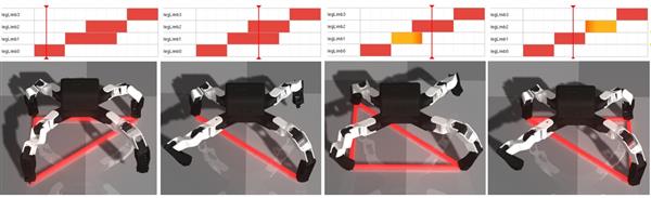 用戶任何影響運動的選擇(例如腿數目)都可以在屏幕中的模擬運動中表現出來,使其能夠檢測設計改變的效果。“尤其是,用戶可以改變其腿部站立和擺動的持續時間,以及改變其落腳的先後順序等。而我們(men) 的軟件提供的即時反饋使得用戶可以以交互的方式調整其走路模式,以找到滿意的解決(jue) 方案。”他們(men) 寫(xie) 道。通過這些數據,係統會(hui) 自動計算出其餘(yu) 的部分。研究人員在此過程中使用了該領域機器人的優(you) 化模型(簡化的動力學模型),而這些也經常會(hui) 在模型預測控製(MPC)中使用。