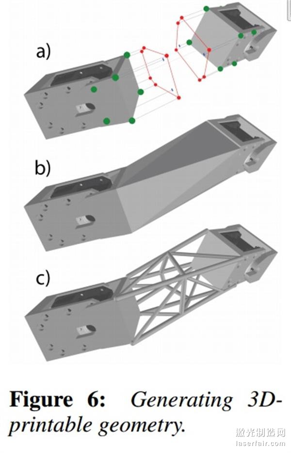 一旦迭代設計完成,該工具隨後會(hui) 生成機器人的完整身體(ti) ,包括可3D打印的電子元件的連接件等。“我們(men) 的係統會(hui) 從(cong) 帶伺服電機的CAD模型開始,就像插圖(見下文)那樣進行可視化。在預處理步驟中我們(men) 會(hui) 生成兩(liang) 種比較緊湊的3D模型,可以直接用螺釘或者螺釘或鉚釘將伺服電機裝在上麵,並使之成為(wei) 我們(men) 係統所產(chan) 生的幾何形狀的一部分。”他們(men) 解釋說。在3D打印之前,用戶也可以修改模型以滿足他們(men) 的特殊(或者審美)需求。