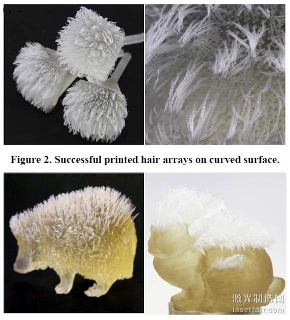 更重要的是,他們(men) 已經用這個(ge) 工具測試過一係列毛發結構的應用類型,比如像動物或者花的模型的曲麵上,甚至在刷子上按照指定的紋理打印。他們(men) 甚至可以3D打印非常濃密的毛發,稍加摩擦就可以緊緊粘在一起。所有這些毛發都可以在50微米的精度上製造出來,用戶隻需定義(yi) 其厚度、密度和高度即可。
