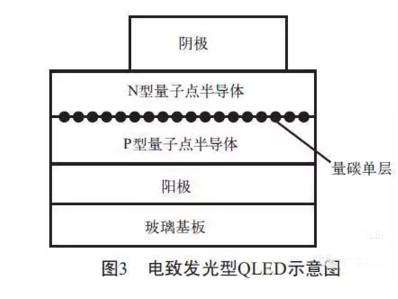 量子點是QLED發光的基本材料。實現QLED發光的主要有兩(liang) 種形式:一是采用在GaN基LED中作為(wei) 光轉換層,有效吸收藍光發射出波長在可見光範圍內(nei) 精確可調的各色光;二是采用其電致發光形式,將其塗敷於(yu) 薄膜電極之間而發光(見圖3)。