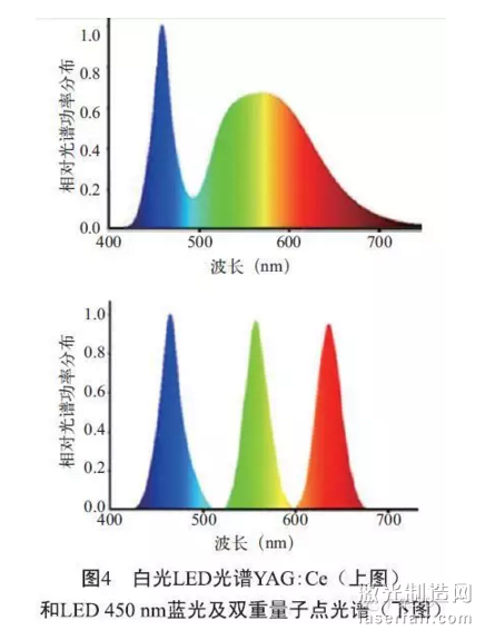 作為(wei) 照明用的QLED,它有3個(ge) 突出的優(you) 點:①能發射出全光譜,即涵蓋整個(ge) 可見光和紅外光區;②它們(men) 能局限量子發光性質,並釋放出較小頻寬的色光,發射出的波長半寬度在20 nm以下,因而呈現出更加飽和的光色;③量子效率可達90%,以後還將會(hui) 有更高的提升空間(見圖4)。