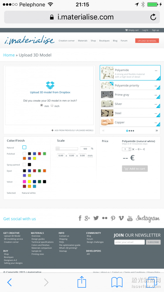 這時候,係統將自動打開Dropbox賬戶頁麵,讓用戶選擇目標文件。換句話說,如果您已經預先將3D文件(stl、obj等)上傳(chuan) 到Dropbox,那麽(me) 可以隨時隨地通過iphoness、ipads下單將其3D打印出來。上傳(chuan) 完模型之後剩下要做的就是從(cong) 列表的100多種不同材料中選擇一種,然後點擊完成即可。