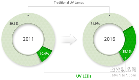 UV LED是LED的一種能發出200nm-400nm不同波長的紫外線,根據不同的波長範圍,可應用於(yu) 殺菌、空氣淨化、醫療、氣體(ti) 探測、食品製造、美容等多種領域。與(yu) 傳(chuan) 統汞燈相比,UV LED具有省電節能、熱損失較少、壽命長、以及固化波長較集中的特點,因而受到市場青睞,正成為(wei) LED領域的新藍海。目前UV LED開始逐步取代傳(chuan) 統紫外光源,Yole development預計2016年UV LED市場規模將達到$150million, 在傳(chuan) 統UV市場上的占有率將從(cong) 2011年的10.4%增加到2016年的28.1%。