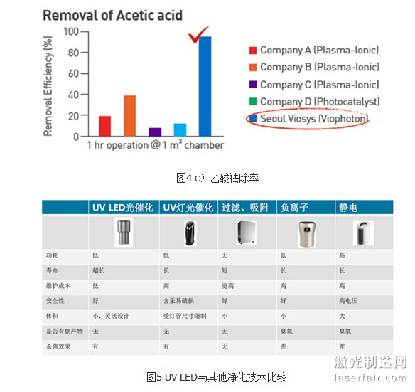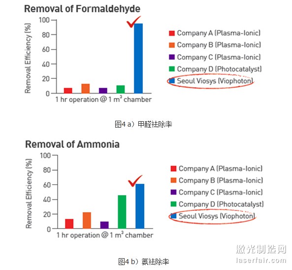 下圖是首爾Viosesys的Viophoton技術與(yu) 其他公司技術方案對甲醛、氨、乙酸等物質的祛除率比較,可以看到,Viophoton技術明顯優(you) 於(yu) 其他方案。