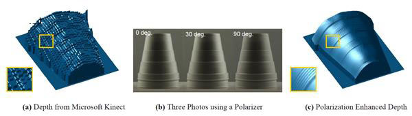 為(wei) 此,研究人員使用了一台微軟的Kinect,並將普通偏光攝影鏡頭放在鏡頭前。在每一個(ge) 實驗中,研究人員使用三個(ge) 不同的濾鏡對同一個(ge) 對象拍攝三張照片,並用他們(men) 的算法對所獲圖像的光強度進行對比。經過多次實驗,結果是明確的:原本Kinect的分辨率為(wei) 1厘米左右,但是通過結合偏振光信息,它可以實現高達100微米的分辨率,是之前的1000倍。