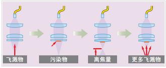 激光焊接過程中離焦量的產(chan) 生過程如圖1所示。為(wei) 了便於(yu) 討論,我們(men) 假設具有非常低的吸收率的透鏡和一個(ge) 保護蓋片的1微米聚焦光學組件在非常潔淨的情況下開始傳(chuan) 輸。不幸的是,這種情況在生產(chan) 環境中是很少存在的。有時在焊接時(或之前),煙塵、蒸汽、油、飛濺物或其他形式的汙染物會(hui) 在最近的光學表麵上發現——保護玻璃窗口。這種汙染會(hui) 使得窗口局部過熱,產(chan) 生熱變形和窗口折射率的變化。這個(ge) 結果會(hui) 導致焦點遠離工作麵而向光學組件移動,從(cong) 而產(chan) 生更多汙染和焊接熔深的損失。