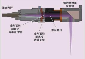 依據這些準則,EWI製作出一種“複合式”聚焦光學組件,綽號叫“bazooka(火箭筒)”(圖2),該組件集合了多種創新的功能。首先,激光光纖發散光束的準直是用經過金剛石切削處理的硫化鋅材料透鏡完成的,這種材料的熱導率是傳(chuan) 統的光學傳(chuan) 輸材料石英玻璃的20倍。對這種材料進行金剛石車削(DT)意味著可以在凸麵得到理論上完美的透鏡麵形。其次,這個(ge) 透鏡的平麵一側(ce) 通過與(yu) 另一個(ge) DT表麵(水冷透鏡支架)直接接觸來冷卻。這樣的DT麵與(yu) DT麵接觸能產(chan) 生極其高效的熱傳(chuan) 遞,從(cong) 而讓準直透鏡保持冷卻。