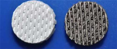 圖1. 3D打印純生物陶瓷支架(左)與(yu) 生物活性陶瓷/氧化石墨烯複合支架(右)。