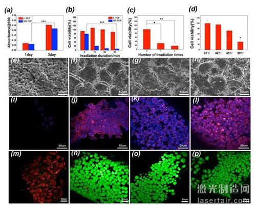 圖2. 3D打印生物陶瓷/石墨烯複合支架在近紅外光誘導的光熱效應有效地殺死腫瘤細胞(b, c, d, e, f, and m),如果在沒有近紅外光照射以及純的生物陶瓷支架上,腫瘤細胞生長完好(a, f, g, h, j, k, l, n, o and p)。