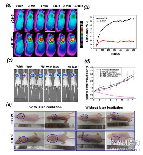 在體(ti) 外骨腫瘤細胞殺傷(shang) 率達到90%(見圖2)。在小鼠體(ti) 內(nei) 植入該功能化的支架並進行光照後,有效地抑製了裸鼠皮下腫瘤生長,而對照組腫瘤體(ti) 積隨天數持續增大(見圖3)。同時,該支架還能顯著促進骨間充質幹細胞的增殖與(yu) 成骨分化,並誘導體(ti) 內(nei) 新生骨組織的長入,從(cong) 而賦予了3D打印生物陶瓷支架抗腫瘤和骨修複的雙功能性,在骨腫瘤的治療與(yu) 修複中具有潛在的應用。
