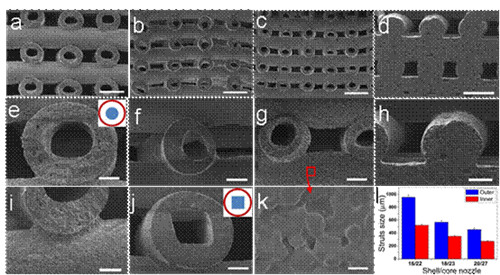圖4. 3D打印具有中空管狀結構生物陶瓷支架用於(yu) 大塊骨組織缺損的修複與(yu) 再生,中空管狀形貌與(yu) 尺度可以得到很好的控製。