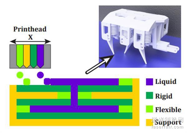 眾(zhong) 所周知,很多高端的3D打印機往往配備有多個(ge) 擠出機,這使得他們(men) 能夠在同一個(ge) 打印對象上同時使用多種材料。這就意味著,人們(men) 通過3D打印可以創建包括多種顏色和材質,兼有剛性部分和柔性部分的部件。而MIT的科學家們(men) 在此基礎上提出的新概念則涉及到了將一種非固化液體(ti) 與(yu) 其他常規3D打印材料同時擠出。因此,在打印過程中,常規3D打印材料將硬化成固體(ti) 部分,但是上述非固化液體(ti) 則不會(hui) 。