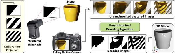 現有3D掃描技術的問題是,它往往依賴於(yu) 一種被稱為(wei) 結構光的昂貴圖像捕獲機製——該技術將連續的光圖案投射到目標對象上,被相機捕獲。然後根據這些圖案在掃描對象表麵產(chan) 生的變形,形成對象的3D模型。要做到這一切,硬件(特別是圖案投影儀(yi) 和相機)需要完全同步,因此成本自然就上去了。