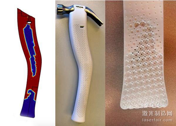 TNO還注重利用多尺度建模以便於(yu) 在一個(ge) 更大的尺度上優(you) 化材料涉及,從(cong) 而將其微觀結構模擬用於(yu) 實際大小的3D打印產(chan) 品。此外,他們(men) 也在一直致力於(yu) 通過改變各種密度有效地將虛擬材料設計轉化成3D打印的對象,比如下圖所示的3D打印錘柄的結構。正如COMSOL的博客上介紹的:“該設計是由微觀尺度上不同類型的晶胞組成的,並經過優(you) 化以獲得適當的剛度和最少的材料需要。”