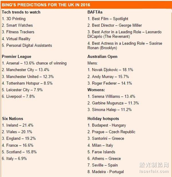 這一大膽預測隻是必應剛剛完成的一係列繁多預測中的一部分,其它還包括體(ti) 育賽事結果、最受歡迎的度假勝地,甚至包括什麽(me) 電影會(hui) 在電影節上獲獎等等。比如該搜索引擎就預測布達佩斯將是今年最大的旅遊熱點、Novak Djokovic將贏取澳網公開賽冠軍(jun) ,而阿森納將在英超聯賽中笑到最後。