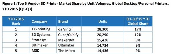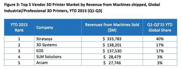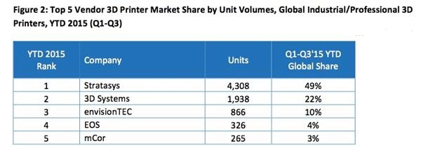 轉到工業(ye) /專(zhuan) 業(ye) 級3D打印機市場,2015年前三季度,全球工業(ye) /專(zhuan) 業(ye) 級3D打印機的銷量同比下降了3%,隻有8,706台。Stratasys和3D Systems繼續引領市場。這兩(liang) 家提供著最為(wei) 豐(feng) 富、最多樣化的工業(ye) 級3D打印機產(chan) 品線,產(chan) 品價(jia) 格從(cong) 2萬(wan) 美元到150萬(wan) 美元不等。不過CONTEXT稱:“在工業(ye) 級3D打印市場,更為(wei) 看重的是銷售額,而不單是銷售機器的數量。”在這個(ge) 工業(ye) 級3D打印機市場上,銷售額排名前5位的除了上述兩(liang) 位之外,還有EOS、SLM Solutions和Arcam;銷量排名前五的則是Stratasys、3D Systems、envisionETC、EOS、Mcor。(見下表)