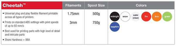 NinjaTek此次推出的首款新型3D打印線材是Cheetah,這是一款柔性聚氨酯(PU)類3D打印材料,可用於(yu) 所有類型的FDM 3D打印機,用戶隻需使用與(yu) ABS材料相同的設置即可。該公司稱,Cheetah 3D打印材料的主要優(you) 勢是與(yu) 其它柔性材料相比,它可以實現更快的3D打印速度(最高為(wei) 60毫米/秒),並擁有優(you) 異的層間附著力和有限的回縮率。