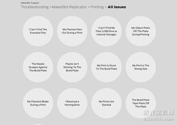 所以MakerBot的目的是盡一切努力縮短用戶的問題解決(jue) 周期。而如果在線支持中心的內(nei) 容足夠全麵,那麽(me) 對於(yu) 電話支持的需求就會(hui) 相應地減少,這也從(cong) 另外一個(ge) 方麵節約的公司的成本。在改版後的支持頁麵上,當您選擇“診斷”之後,然後選擇自己有問題的產(chan) 品,其下一頁將彈出該特定產(chan) 品最常見的問題。例如,如果您選擇MakerBot Replicator 2,那麽(me) 這個(ge) 頁麵將為(wei) 您提供以下選項:電氣、機械、安裝、擠出機、打印或3D打印質量。通過逐步選擇逐漸將您的問題縮窄。而且整個(ge) 過程非常簡單,並有大量的教學視頻和文件提供。就算您沒有問題,仍然可以在上麵看看,把它當作教程使用。