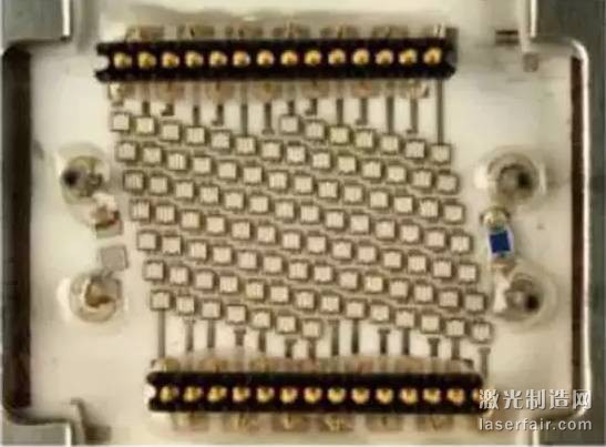 最初98個(ge) LED芯片通過銀膠封裝在氧化鋁陶瓷基板上,如圖所示。