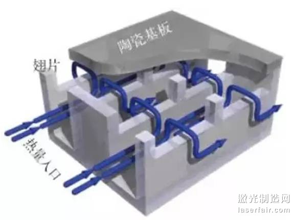 而熱學仿真結果表明,假如提高該模組的散熱特性,輻射功率密度預計可以達到20.8W/cm2 。為(wei) 此,設計了一個(ge) 表麵微型散熱器,如圖所示。