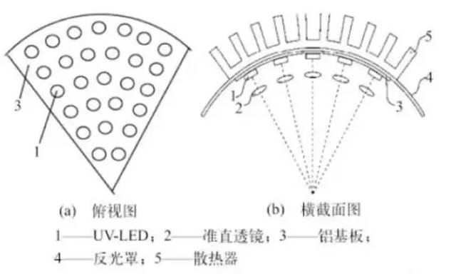 其陣列結構如圖(a)所示,若幹大功率UV-LED組成扇形陣列安裝在鋁基板上,每層UV-LED等間隔分布在以O為(wei) 圓心的圓弧上。沿半徑方向上LED芯片的個(ge) 數逐漸線性增加,從(cong) 而輻照度沿徑向逐漸增加。