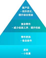 而通常在談到增材製造的時候,不論是製造業還是增材製造行業本身都容易過於關注生產效益,而忽略了綜合效益。而增材製造的價值台階:原型與模具,備品備件,複雜零件,創新產品,在不同的台階中生產效益的價值或許相似,然而綜合效益的價值卻是隨著台階的升高而越來越大。