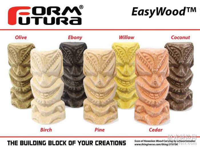 隨著3D打印技術的日漸普及,可用的3D打印材料也日漸繁多。這其中,估計受到人類對木材天然的親(qin) 近感影響,仿木質屬性的3D打印材料顯得獨樹一幟,受到很多3D打印愛好者以及創客們(men) 的喜愛。因此也吸引了很多3D打印線材廠商發布了各種獨特的木質線材產(chan) 品,總部位於(yu) 荷蘭(lan) 的Formfutura公司就是其中之一。