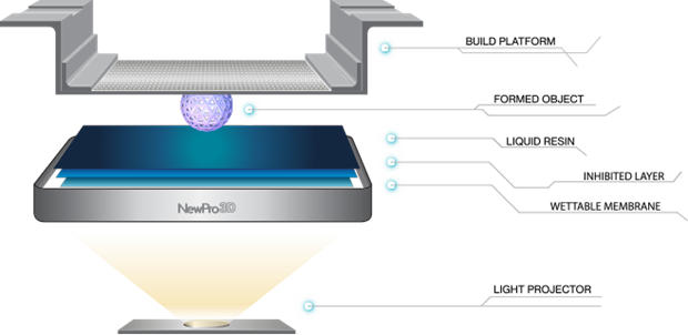 經過兩(liang) 年的研發,NewPro3D相信他們(men) 已經拿出了一種足以“徹底顛覆3D打印速度”技術。該公司發明的智能液體(ti) 界麵(Intelligent Liquid Interface,簡稱lLI)技術有點類似於(yu) DLP,它同樣是基於(yu) 光敏樹脂的,不過將一個(ge) 透明的膜加到了樹脂與(yu) 光源之間,其目的是創造一個(ge) “死區(dead zone)”。這就消除了在類似工藝中的機械複位,並允許對象以創紀錄的速度“生長”。