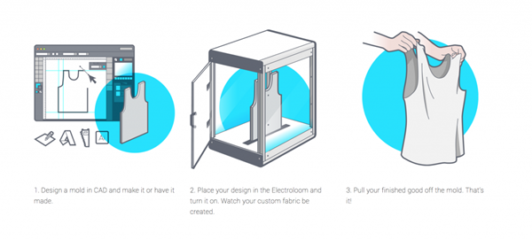 據了解,Electroloom公司的技術是基於(yu) 靜電紡絲(si) (electrospinning)原理的,要使用其3D服裝打印機,首先用戶必須要有一個(ge) 實體(ti) 的模具,這個(ge) 模型可以是CNC加工而成,或者是3D打印的,甚至可以用手工來製作。在將這個(ge) 模具放進Electroloom之後,一種特製的溶液或者油墨被注入機器,並借助電場的引導變成纖維形式的材料,然後均勻地覆蓋到了模具上,直到完成任務。當該對象被從(cong) 機器中彈出後,用戶就擁有了一件完整的、無縫的服裝。