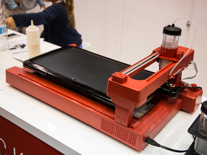 那麽(me) ,PancakeBot可以烹飪什麽(me) 樣的煎餅呢?去年我看到它做出了蝴蝶、霸王龍恐龍和宇航員形狀的煎餅。此外它一次可以使用多種顏色的蛋糕糊,用戶也可以設計製作更複雜的食物。例如,我們(men) 可以用它製作一個(ge) 可食用的CNET標誌。