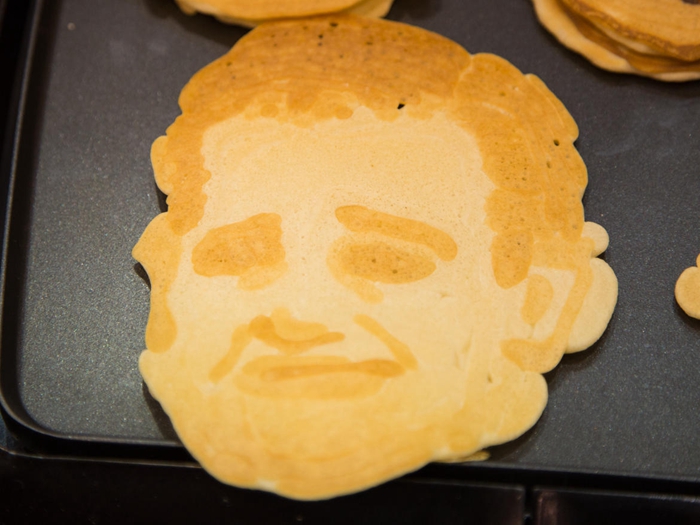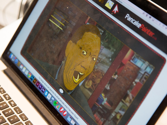 這時,這一打印機將使用麵糊將圖案繪製到熱鍋上,這一過程大約需要3到4分鍾。最後,我們(men) 將煎餅翻過來後,我看到了自己的完整容貌,包括眼鏡、胡子。