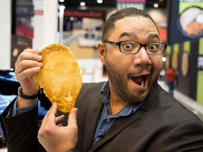 在今年的國際家庭用品博覽會(hui) 上我對PancakeBot進行了終極試驗,以我的臉部形狀製作成一張煎餅。不過,要想取得成功,該設備最好能夠將一張智能手機自拍快照轉換成一個(ge) 有說服力的真正可食用照片。