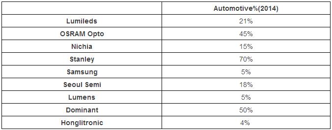 可以看到,近年來國際一線LED供貨商已逐漸減少在背光與(yu) 照明市場的比重,轉而支持在車用與(yu) 其他利基型應用(見下表)。車用的高可靠度需求,使得一線品牌依然享有壟斷市場的優(you) 勢,預料隨著二線品牌的LED在質量上獲得突破,將有機會(hui) 打破市場壟斷的局麵。