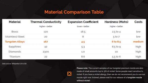 目前該鎢質噴嘴使用的是M6螺紋,可支持1.75毫米線材,如果他們(men) 的眾(zhong) 籌獲得成功的話,該公司還希望能夠再推出一個(ge) 支持2.85/3毫米線材的鎢噴嘴。如前所述,由於(yu) 其能夠承受很高的溫度,並就有很好的耐磨性,因此該噴嘴適用的材料範圍很廣,目前可支持的材料包括PEEK、尼龍、ABS、聚碳酸酯(M6)、甚至包括一些很磨噴嘴的材料,如碳纖維等。