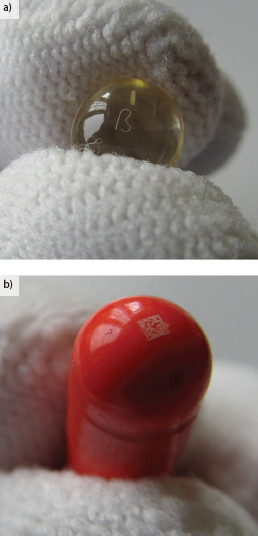 圖3:紫外線激光標記的軟膠囊(a)和硬膠囊(b)。