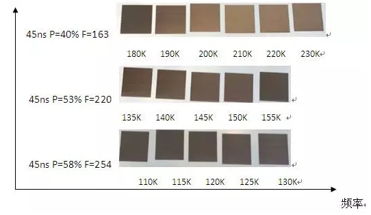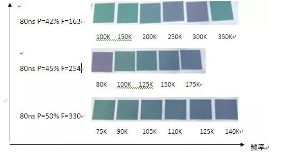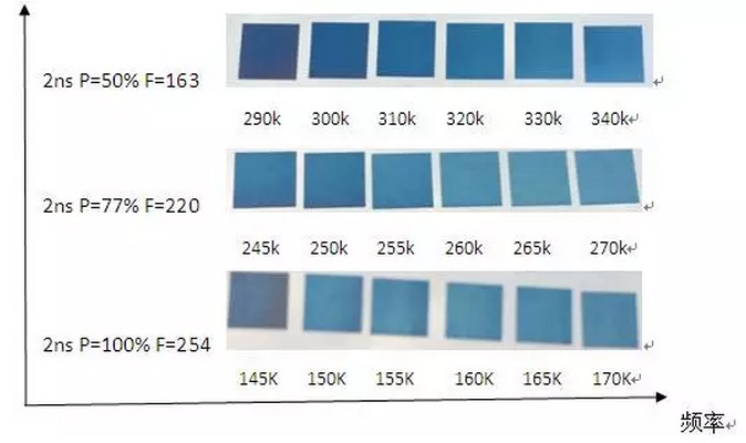 從故事(1)中我們就推導過:在大焦距鏡頭中,功率值的增加,維持了激光功率密度的穩定。但若再以此頻率下的激光脈衝作用到材料表麵,那則會使脈衝重疊率變大,這其實會變相的改變了材料單位麵積內所受的激光能量。因此,在光斑擴大情況下,必須降低頻率以維持原來的光斑重疊率,這樣色彩的一致性會更高。如果功率值減小,情況反之。理論分析了這麽多,實踐才是檢驗真理的唯一標準。實際情況到底如何呢?