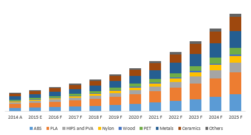 該市場可以按材料類型、應用、區域等進行分類。比如,如果根據線材類型進行分類,該市場可以細分為(wei) ABS、PLA、HIPS和PVA、尼龍、聚酯、陶瓷等。在價(jia) 值方麵,2015年PLA部分估計要占整個(ge) 中東(dong) 3D打印市場份額的22.3%。這部分在預測期內(nei) 將獲得16.7%的年複合增長率。除此之外,金屬材料部分增長顯著,預計在不久的將來將錄得持續增長。