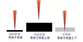 切割不同材料時,要求激光束的焦點落在工件截麵的不同位置。如下圖所示。