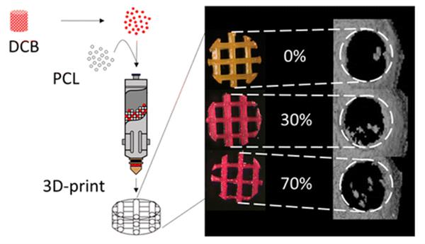 科學家們(men) 一開始就選擇了聚己內(nei) 酯(PCL),這是一種可降解聚酯,經常用於(yu) 製造那些已經獲得FDA批準可以用於(yu) 臨(lin) 床的聚亞(ya) 安酯。“PCL會(hui) 在80到100攝氏度的時候融化,這個(ge) 融點低於(yu) 大多數塑料,所以對於(yu) 那些通常會(hui) 在較高溫度下損壞的生物材料來說,這是一個(ge) 很好的混合對象。”Grayson團隊裏的研究生Ethan Nyberg說。