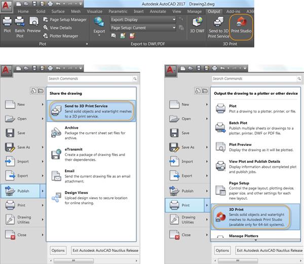 到了AutoCAD 2017,這一切就變得簡單多了。AutoCAD 2017現在提供了兩(liang) 種不同方法讓您把3D模型發送到3D打印機上。您可以選擇“發送到3D打印服務”來創建一個(ge) STL文件,然後將其發送到一個(ge) 3D打印服務那裏;或者您也可以單擊新出現的Print Studio工具,下載和安裝Autodesk Print Studio,這是一個(ge) 單獨的應用程序,它可以使您直接在其8款支持的3D打印機之一上進行打印,或者保存一個(ge) G代碼文件用於(yu) 以後打印。