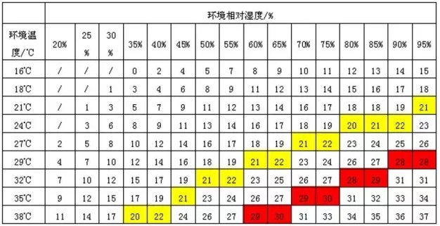 激光器環境溫度(空調房溫度)數值和激光器環境相對濕度(空調房相對濕度)數值交叉處對應的數值若低於(yu) 22,激光器內(nei) 部不會(hui) 結露,若高於(yu) 22,激光器內(nei) 部就有結露的風險,客戶可以通過降低激光器環境溫度(空調房溫度)數值和激光器環境相對濕度(空調房相對濕度)來改善。或者設定好空調的降溫和除濕功能,保持激光器的環境溫度不超過26度,同時保持環境相對濕度小於(yu) 60%。 建議客戶每班注意記錄溫濕度表的數值,以便及時發現問題,防止風險。