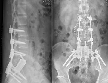 第二步翻身後路,行L345及髂骨螺釘固定,整塊切除後方未被累及的椎板,並確定後方截骨平麵,前後“會師”。