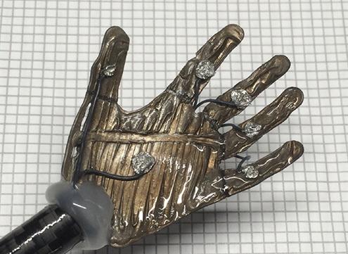 猶他大學的博士研究生James Carrico展示一個小小的3D打印離子聚合物—金屬複合軟機器人手。