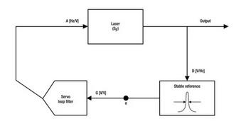 一個基本的反饋控製係統如下圖描述。激光器輸出的一部分光被探測器采集(鑒頻器),輸出誤差信號,伺服控製器分析采樣,並與標準頻率對比,自動調節腔長,將激光頻率恢複到特定的標準頻率上,從而實現穩頻的目的。