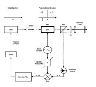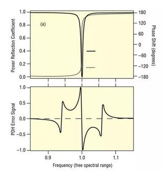 為了探測到激光器的頻率的波動,就需要一個非常穩定的參考頻率做比較。常用的做法是利用一個高精細結構的法布裏—珀羅腔,可以提供一定時間內的穩定性。法布裏—珀羅腔的共振頻率(Vm)取決於腔長L,可以表述為:Vm = m(c/2L)。諧振腔的機械結構隨著時間會有漂移(長時間穩定不會很好),但是可以提供很好的短期穩定性(~秒)。為了將激光器的頻率緊緊地鎖在法布裏—珀羅腔的共振頻率上,必須要能快速的探測到該共振信號,並且具有較高的信噪比SNR。這是反饋係統中最具有挑戰的地方,而且會決定整個係統的性能。