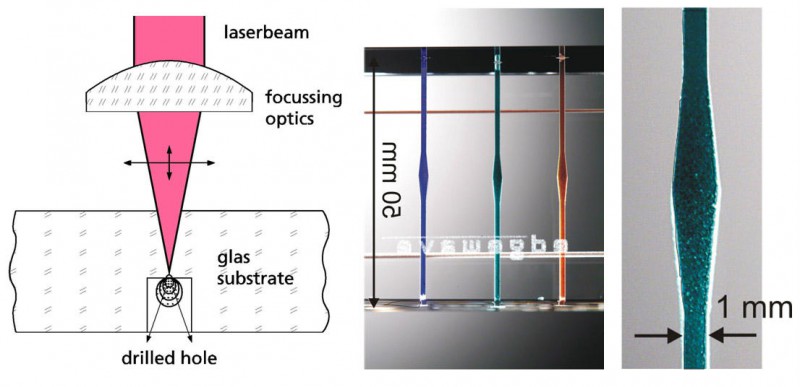 激光束從玻璃的上表麵入射,聚焦到與入射麵相對的另一側的內表麵。與玻璃亞表麵雕刻不同,被激光剝離出來的的基底材料會很容易地飄離加工區域。通過適當而精確的控製激光焦點的位置,就可以實現在玻璃內任意一個截麵進行高精度並具重複性的打孔。這種加工工藝主要具有以下幾個優點: