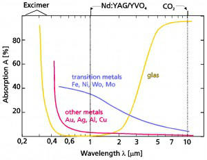 在以往的激光玻璃加工中,通常都隻使用遠紅外或紫外激光。這是由於(yu) 玻璃對激光的吸收局限於(yu) 遠紅外和紫外波段(參圖). 而固體(ti) 激光器的激光波長為(wei) 1µm左右, 它的二倍頻波段在玻璃內(nei) 則幾乎是完全透明的,因此隻有極少一部分激光能量能被吸收並轉換為(wei) 熱。